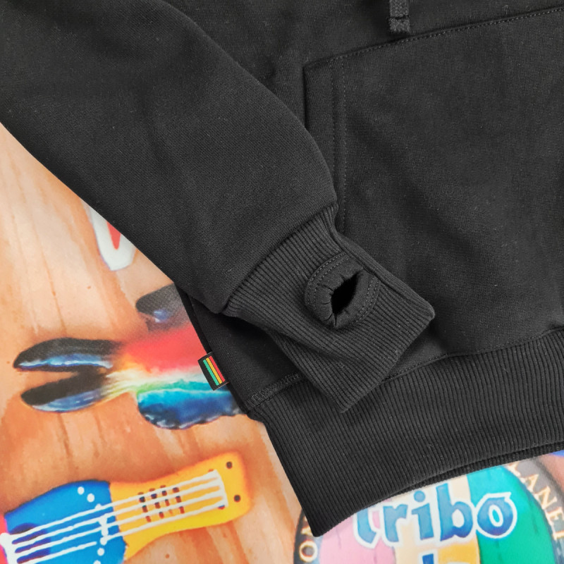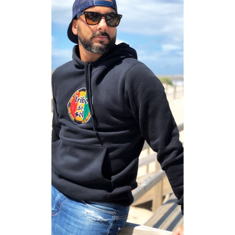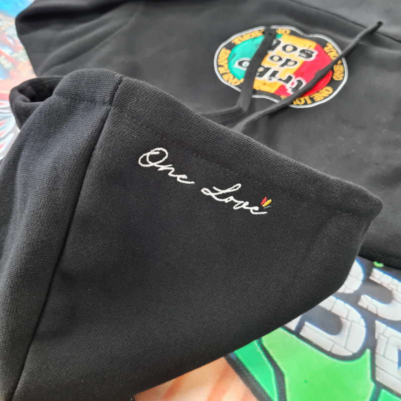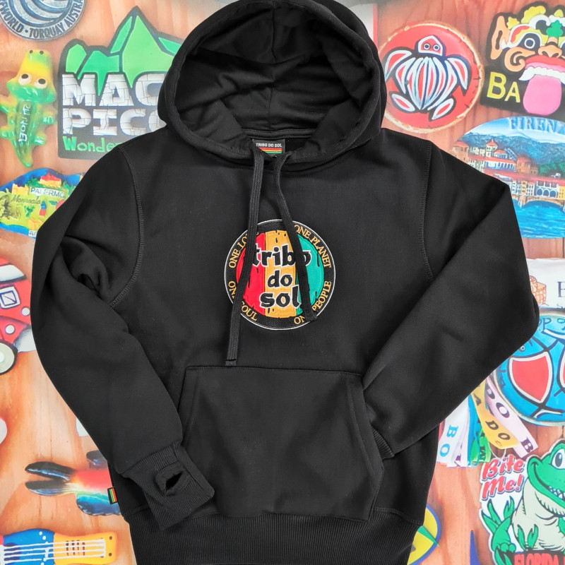 Kanguru com logótipo original Tribo do Sol bordado no peito e apontamento bordado One Love no capuz.