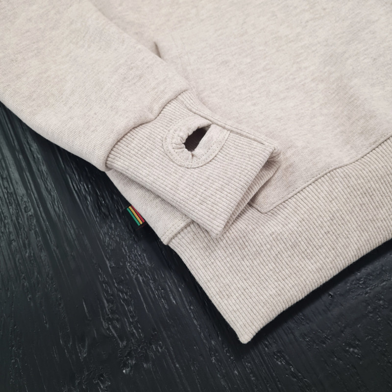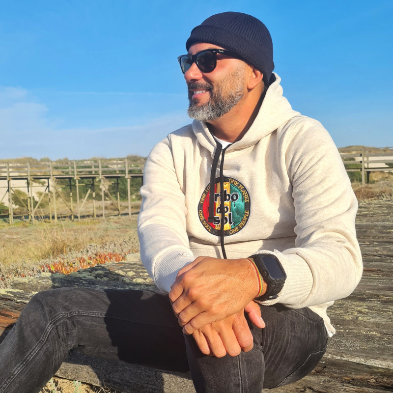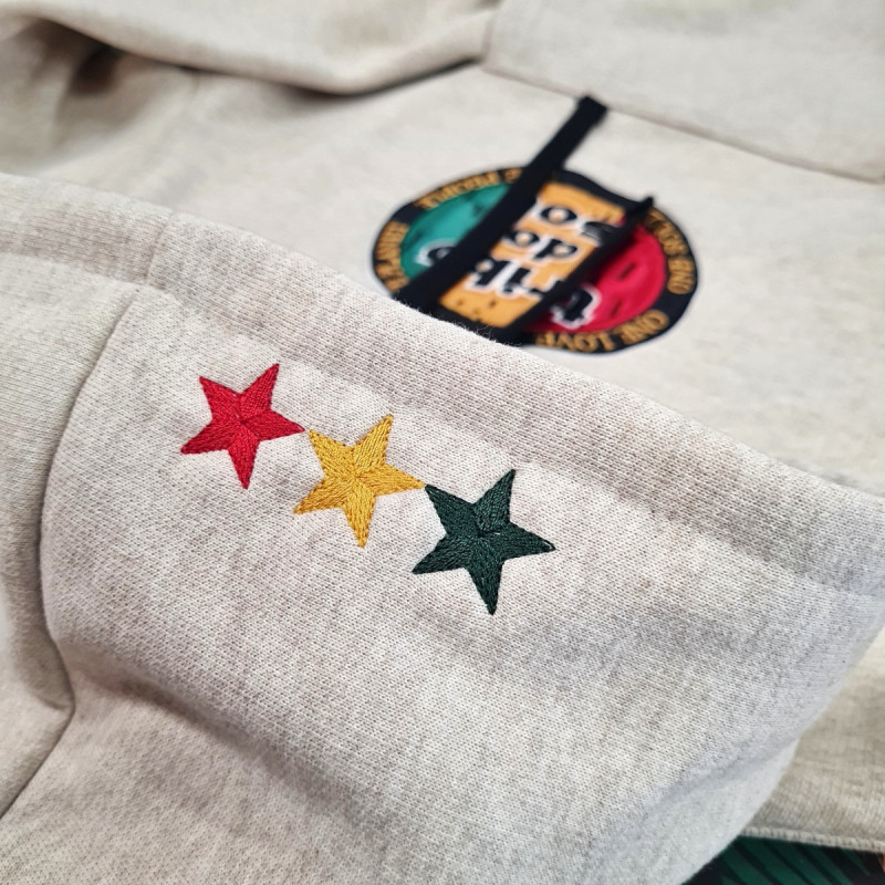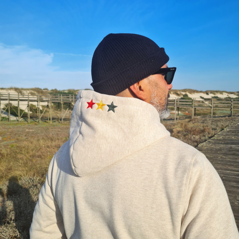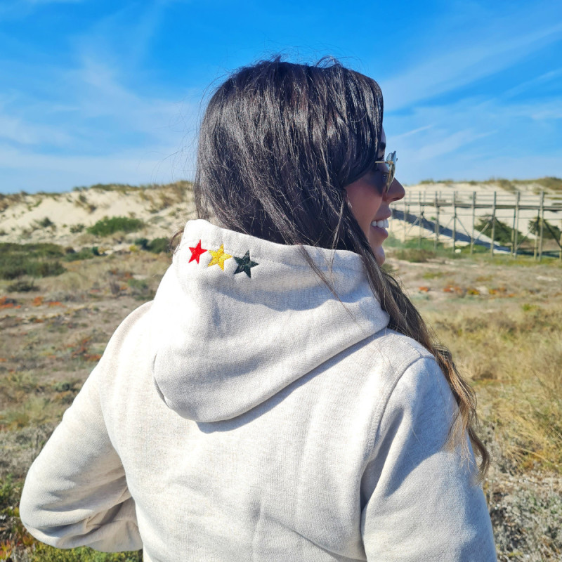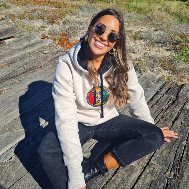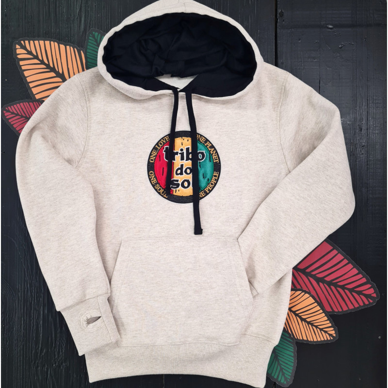 Kanguru com logótipo original Tribo do Sol bordado no peito e apontamento bordado One Love no capuz.