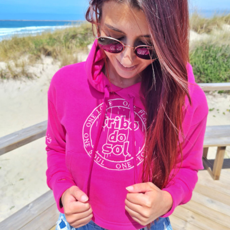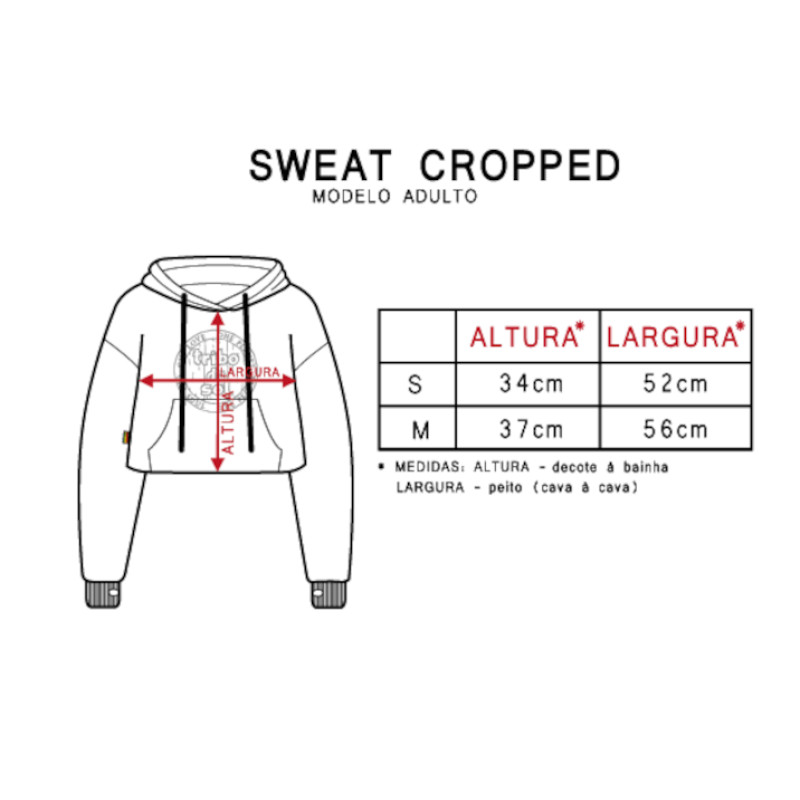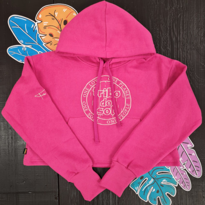 Kanguru cropped com logótipo original Tribo do Sol Outline bordado no peito e bordado de letras na manga.
